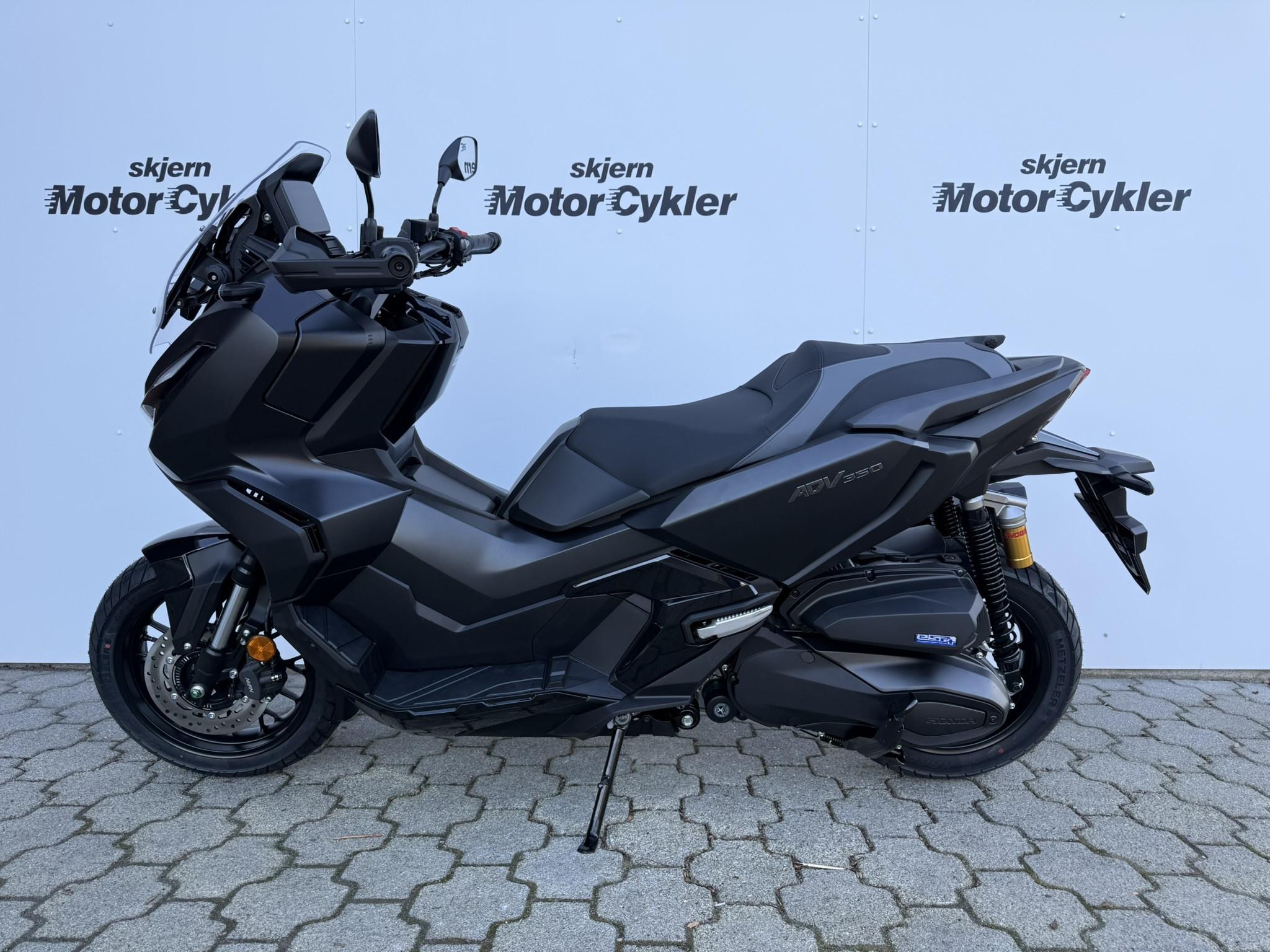 ADV350 er bygget på en let stålrørsramme med 37 mm USD-forgafler, 130 mm vandring bagtil og ABS-skivebremser for og bag. 15” forhjul og 14” baghjul med blokmønstrede dæk giver stabil og tryg kørsel.