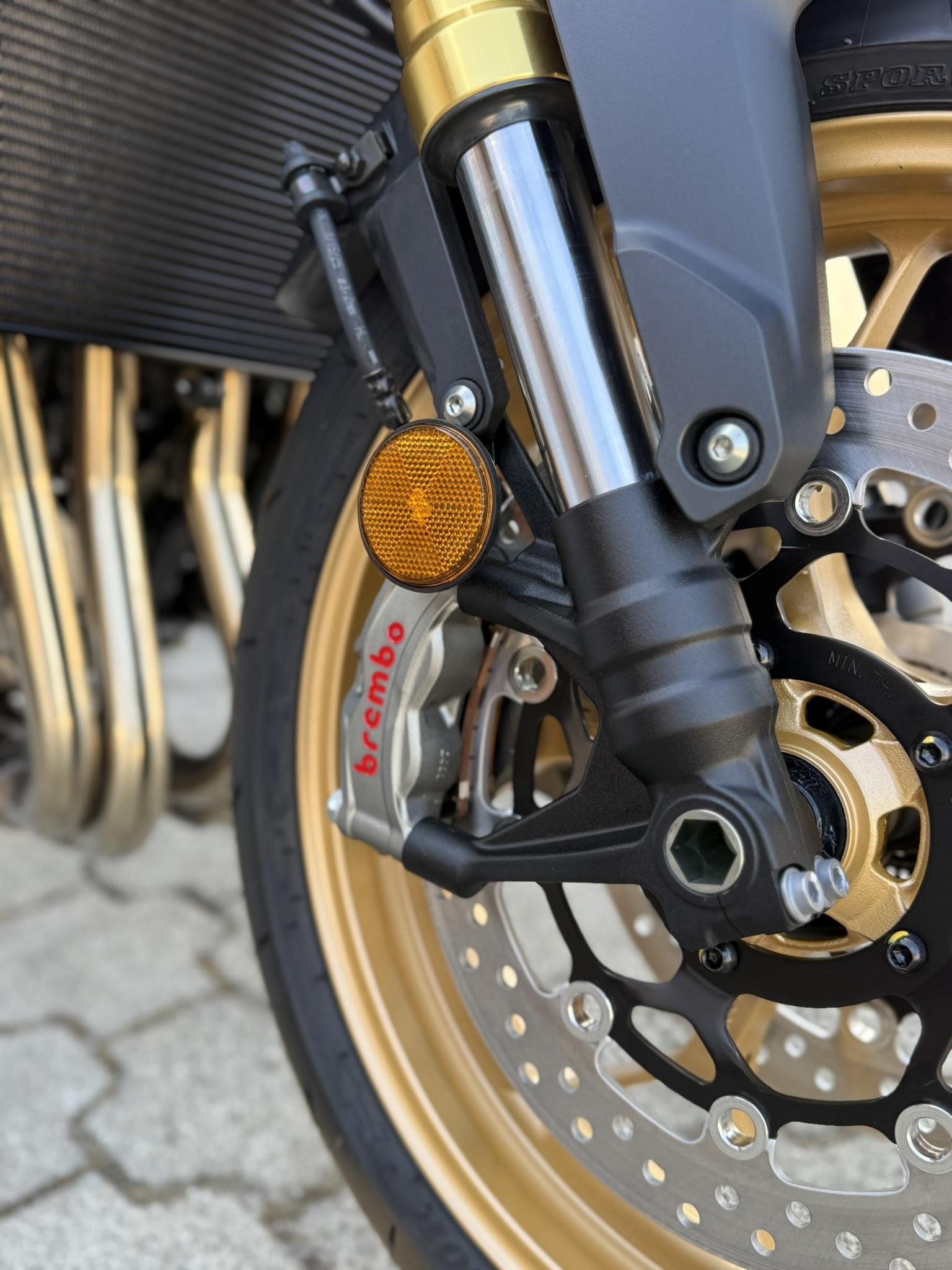 Fireblade-inspireret firecylindret motor på 155 hk. Med fuldt justerbar Showa SFF-BP forgaffel, Öhlins TTX36 bagdæmper og præcisionsbremser fra Brembo, er denne motorcykel bygget til optimal kontrol og sportslige køreegenskaber. En 5-tommers TFT-skærm giver intuitiv betjening, mens unikke detaljer som mat sort lakering og guldfarvede detaljer gør CB1000 Hornet SP til en markant tilføjelse på vejen.