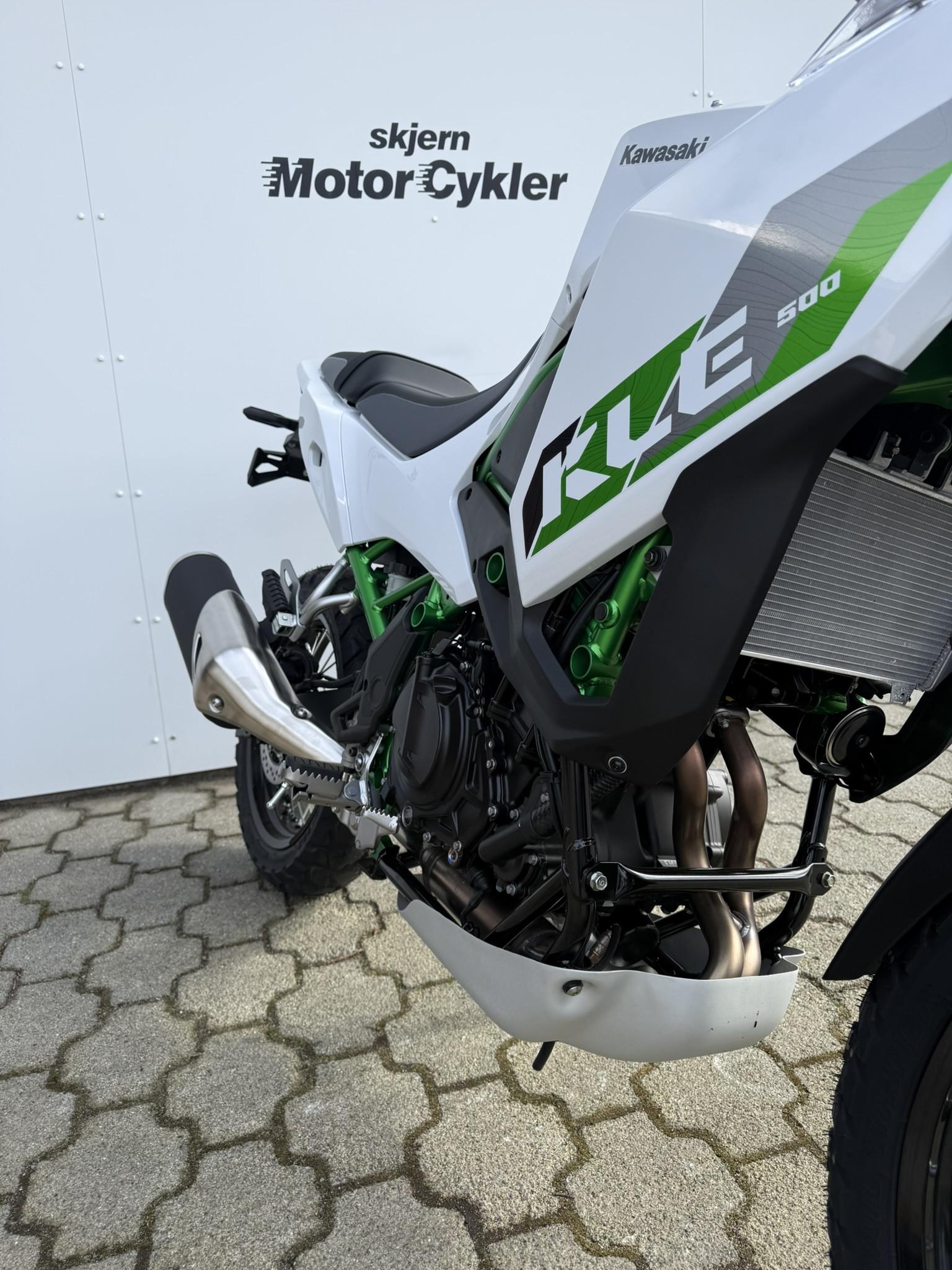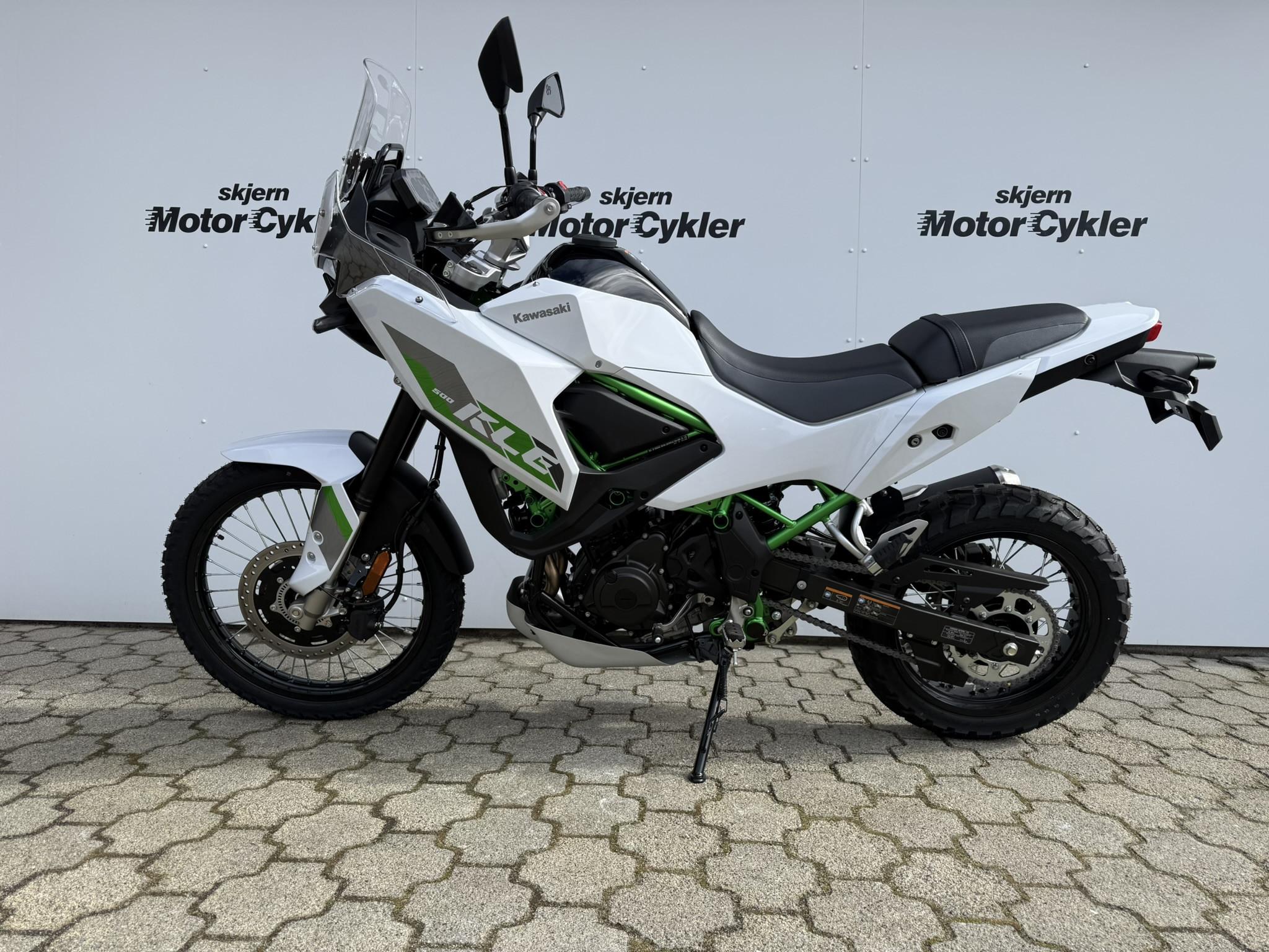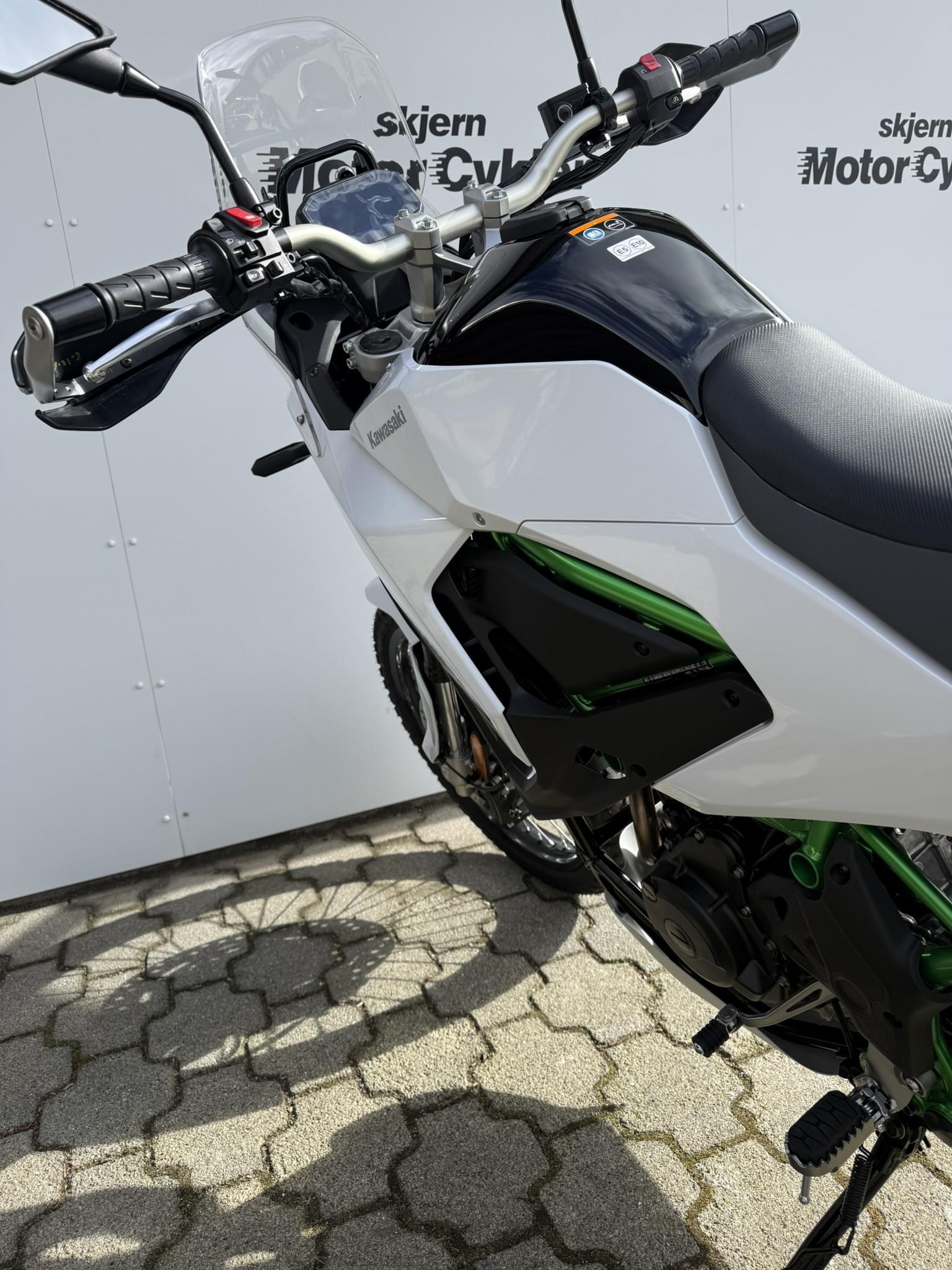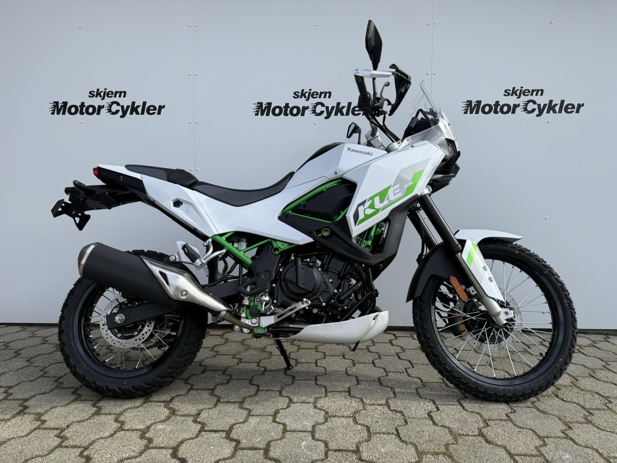 Oplev **Kawasaki KLE500 SE** i Pearl Blizzard White – en moderne og alsidig adventure-motorcykel, der kombinerer komfort, køreglæde og funktionalitet. Modellen er skabt til både daglig pendling og længere ture med oprejst kørestilling, god vindbeskyttelse og robuste egerhjul, der klarer både asfalt og let offroad.
