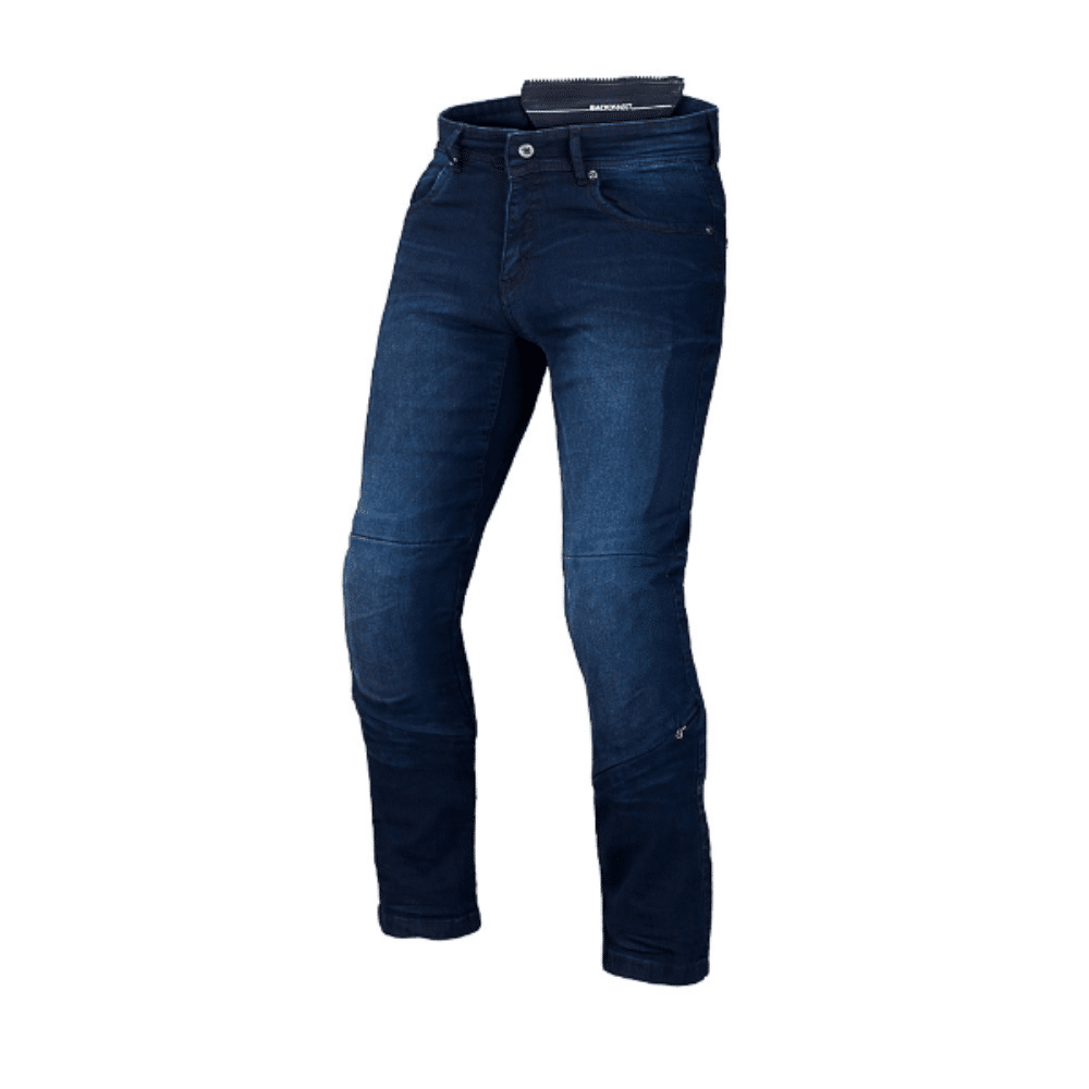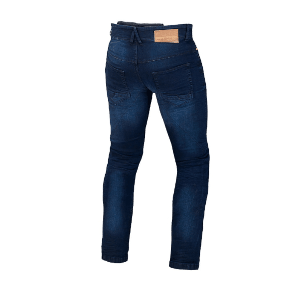 Macnas Stone Jeans er forstærkede denim-jeans med slim fit og kort tilslutningslynlås, designet til motorcyklister i varme køreforhold.
